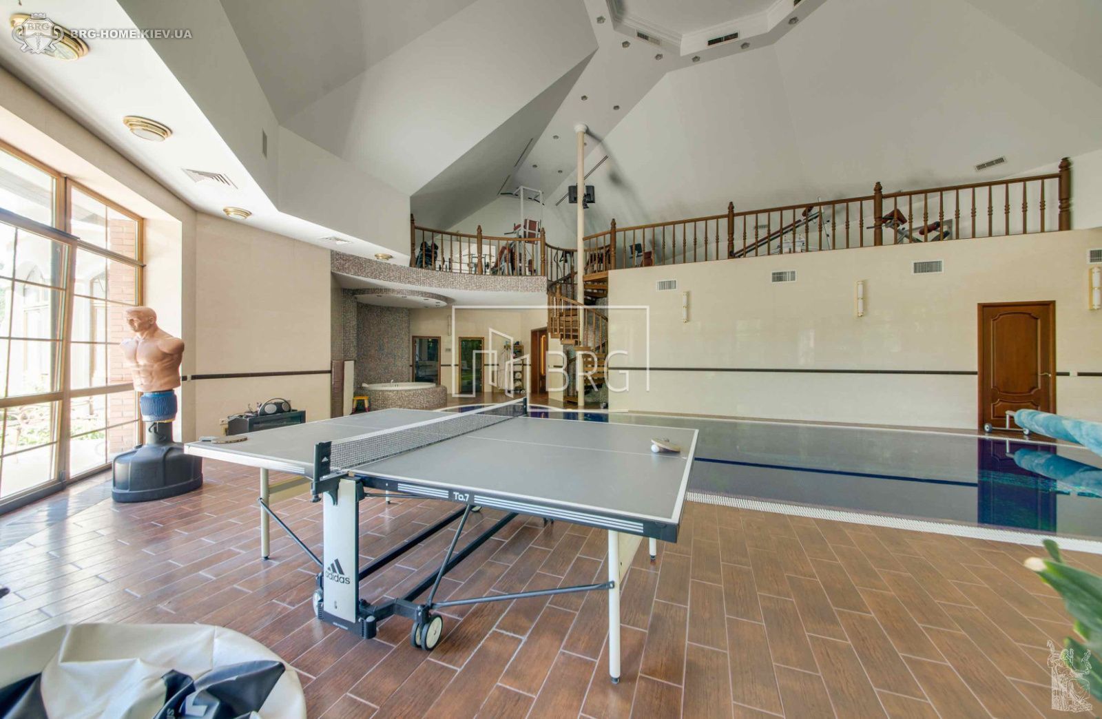 1й этаж – каминный зал, гостиная, столовая, гостевая спальня, СПА зона с бассейном, сауной, тренажерным залом, комната няни и персонала, технические помещения