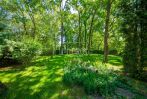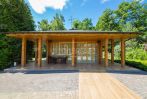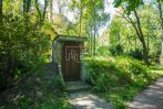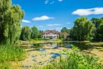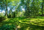 Ландшафтный дизайн, озеро, аллея взрослых деревьев. Гараж и деревянный домик над водой.