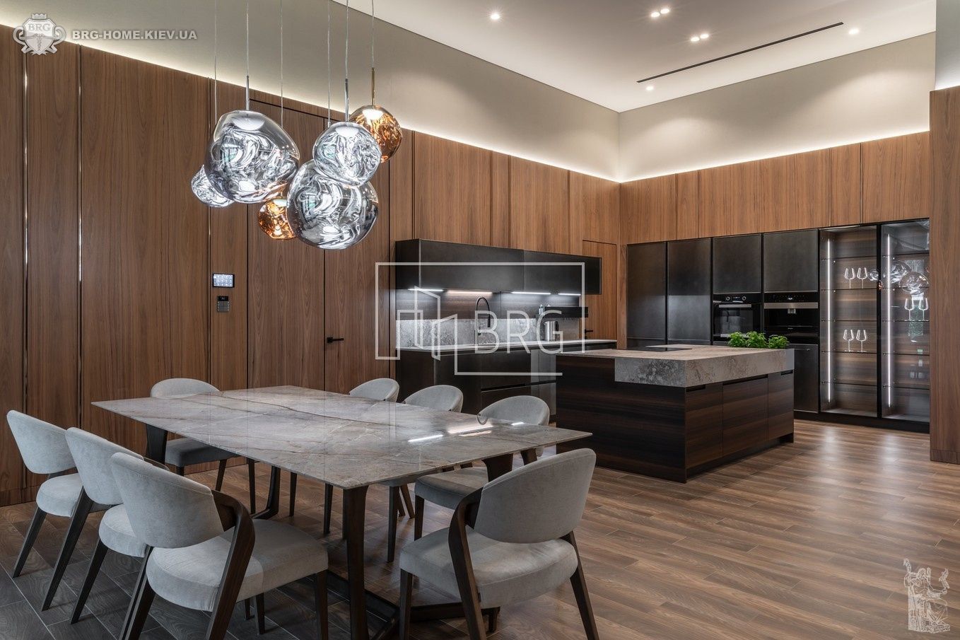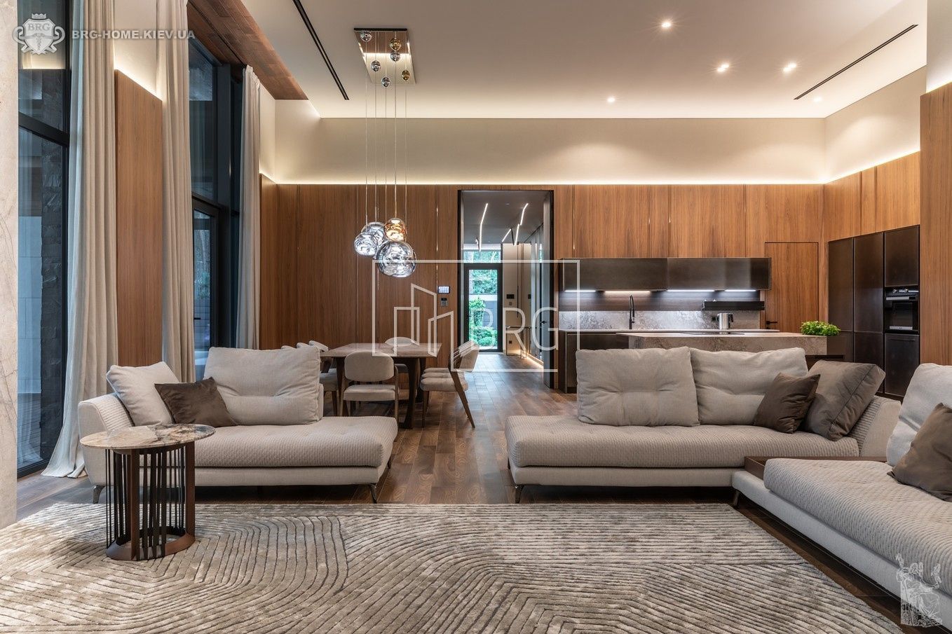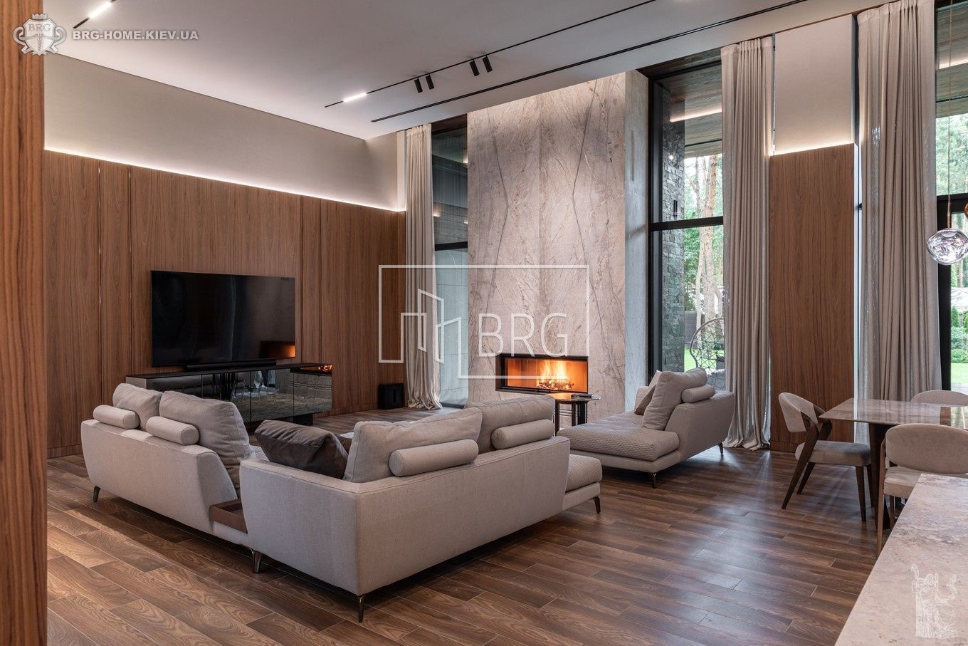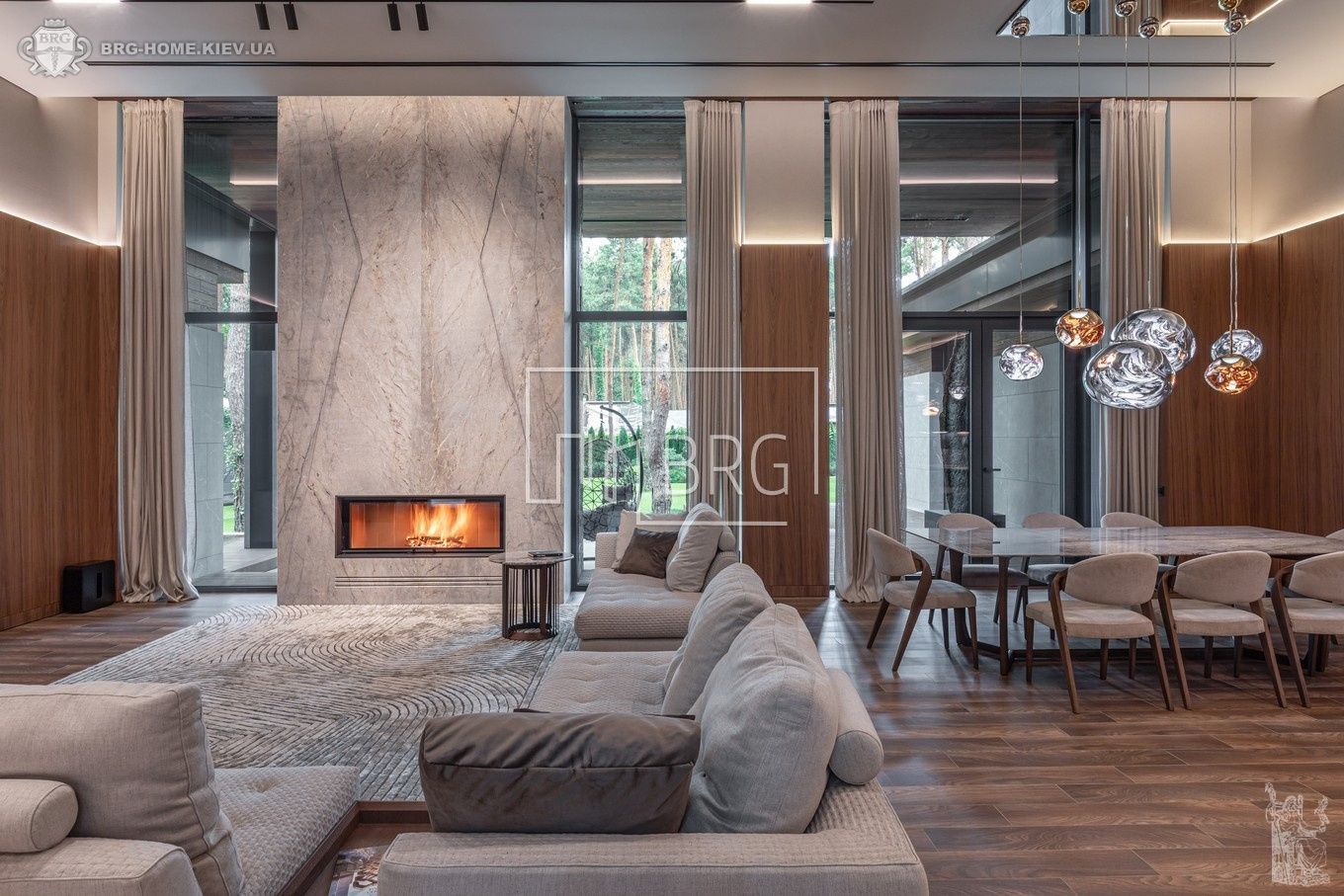 Гостиная с камином, зоной столовой, кухни, выходом на 2 террасы, гостевой с/у, гардеробная, кладовая