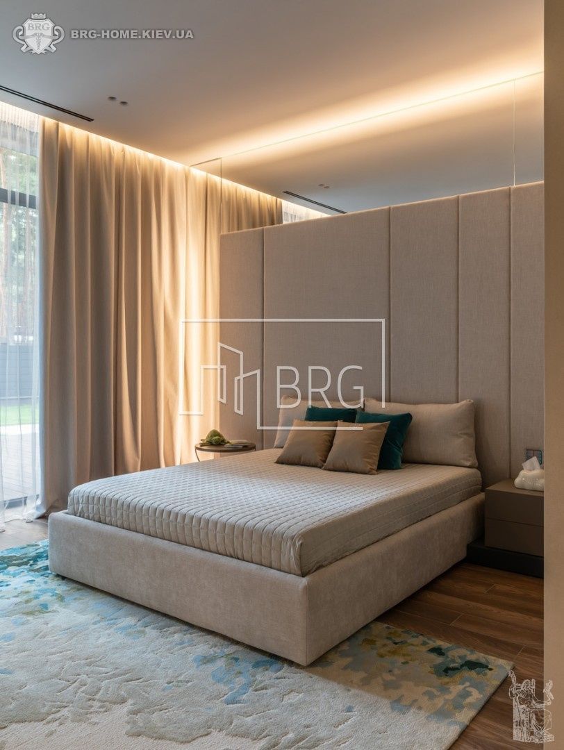 Мастер-спальня с гардеробной и с/у, 2 спальни с с/у, игровая (возможно использовать как дополнительную спальню) Рабочий блок: рабочая кухня, постирочная, с/у для персонала, котельная, гараж на 2 авто