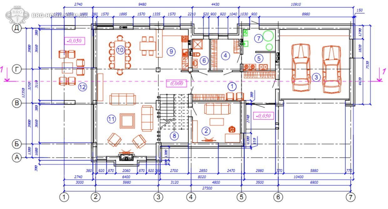 1-й этаж: гостиная с камином, кухня, столовая, кабинет/гостевая комната, гостевой с/у, постирочная, гардеробная, котельная, гараж на 2 авто, выход на летнюю террасу